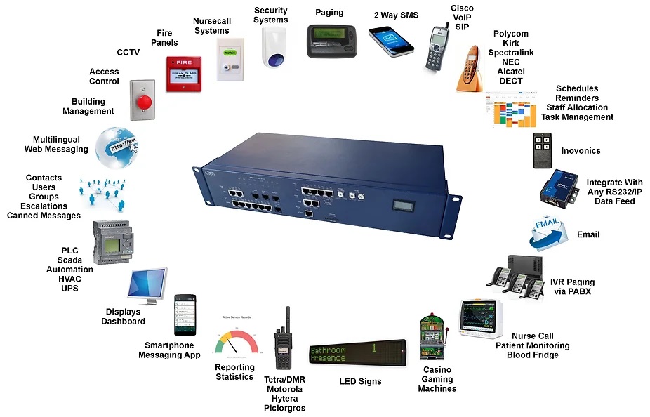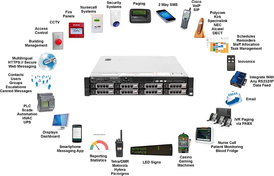email, terminales WiFi/DECT/TETRA, paneles LED, buscapersonas, etc.