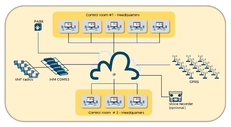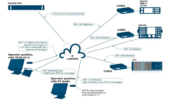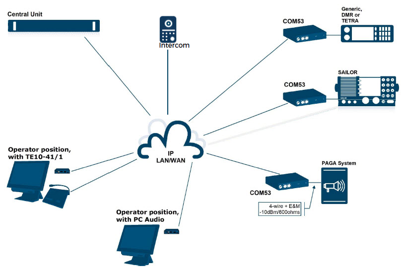 En su versión básica la consola está configurada para conectarse por VoIP a una o dos radios a través del controlador IP COM-53.