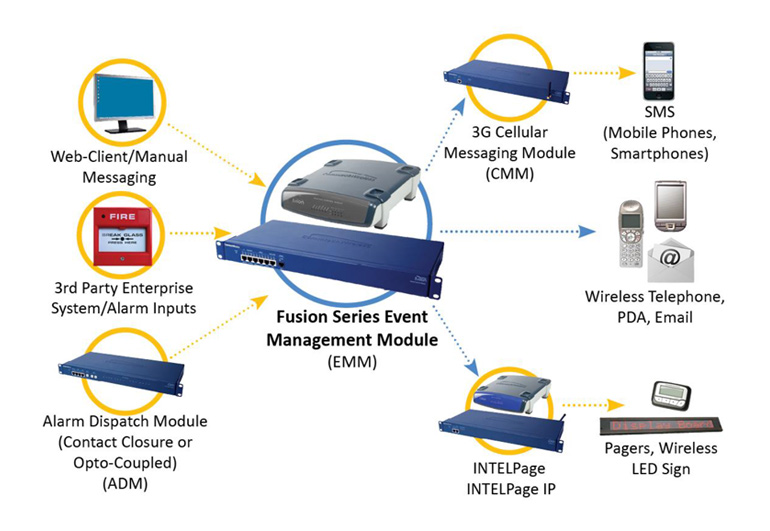 El EMM detecta la información crítica y la distribuye a través de una serie de dispositivos inalámbricos y por cable. Por ejemplo, cuando suena una alarma de fuego en una