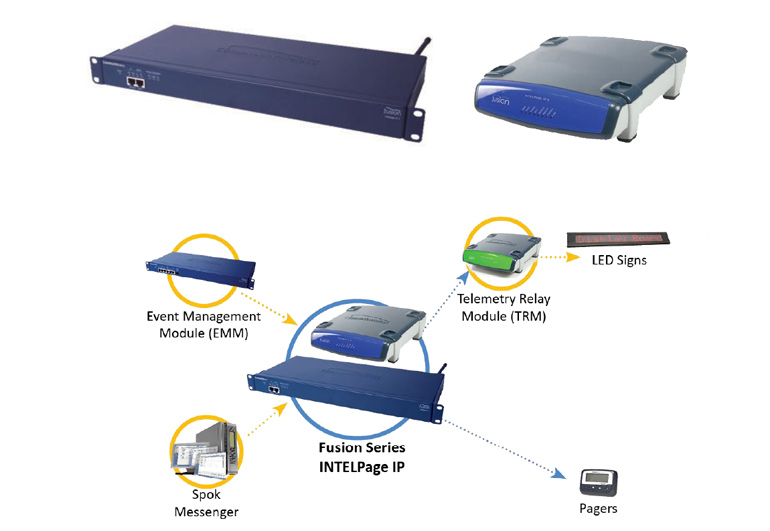 El INTELPage IP está disponible en 5W, 25W, 50W e incluso 100W. Se conecta por IP/Ethernet al Fusion EMM y al aplicativo Messenger de Spok. El INTELPage IP se puede también conectar