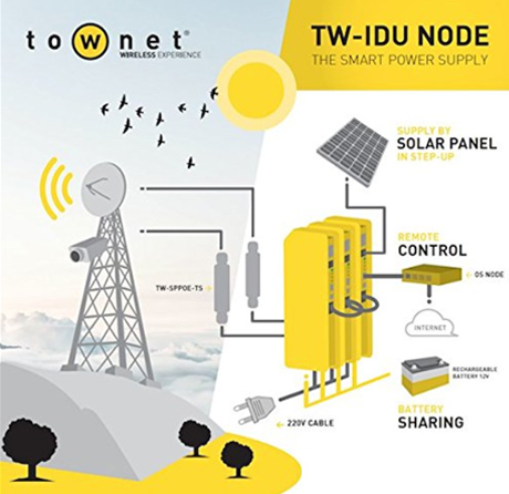 Cuando la TW-IDU NODE se alimenta por medio de paneles solares, el Smart Power Management (Gestión Inteligente de Energía) dirige toda la energía necesaria a los equipos conectados, dejando sólo el excedente para la carga de la batería. Con la prioridad de carga y el excedente a la batería, el suministro solar se vuelve inteligente.